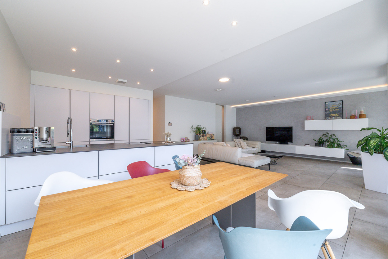Der großzügige Wohn- und Essbereich mit großen Fensterfronten öffnet sich zur geschützten Terrasse im begrünten Innenhof – ideal zum Entspannen. Die hochwertige Einbauküche mit Glasfronten und Kochinsel ist bereits im Kaufpreis enthalten. Ein modernes Bad, ein separates Gäste-WC, zwei vielseitig nutzbare Zimmer und ein praktischer Abstellraum ergänzen das Angebot.