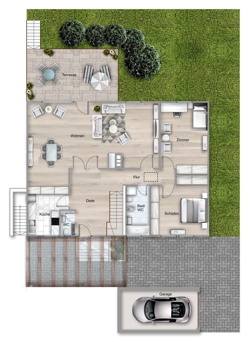 Zum Haus gehören eine Garage sowie ein zusätzlicher Carport, die komfortable Parkmöglichkeiten bieten.